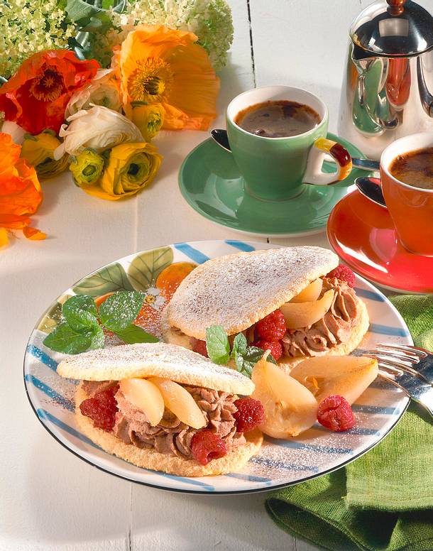 Rotweinsuppe mit babybirnen. Birnenspalten und himbeeren darauf verteilen. Mit puderzucker und kakao bestuben. Jeweils mit einer zweiten platte bedecken.